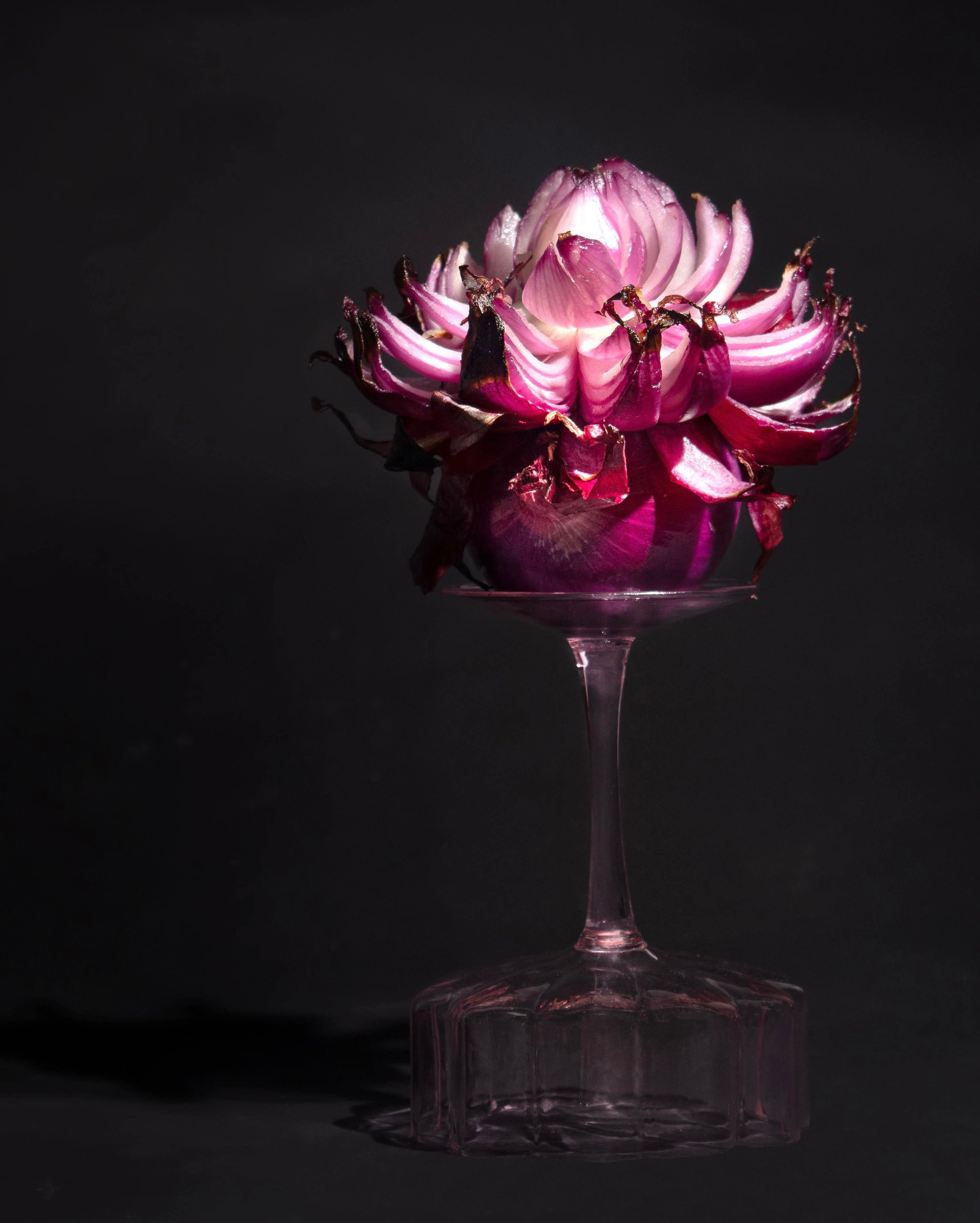 A pink and purple Onion placed on a tall, transparent glass against a dark background.
