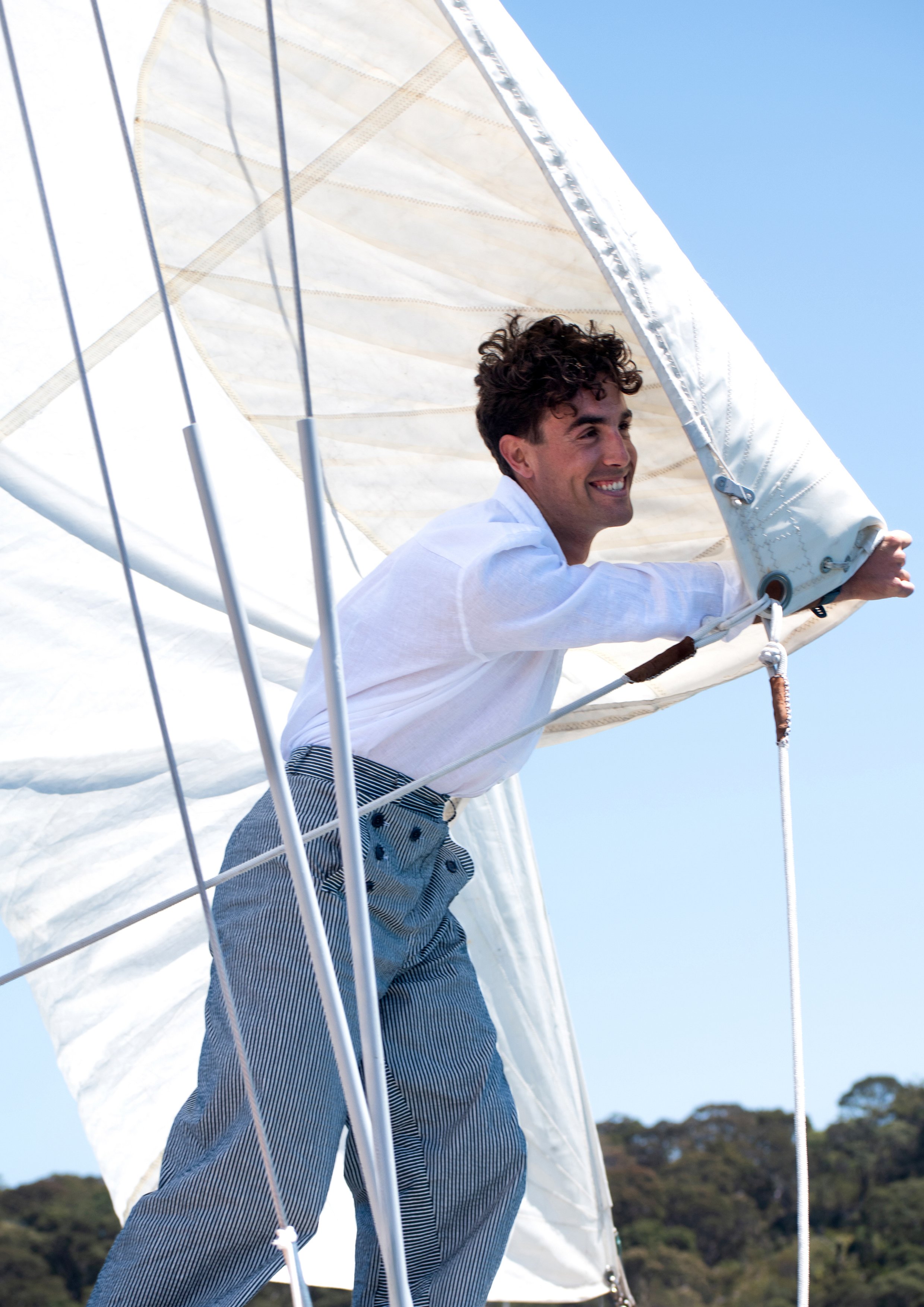 A smiling man in a white shirt and striped pants sitting on a sailboat with a clear blue sky in the background.
