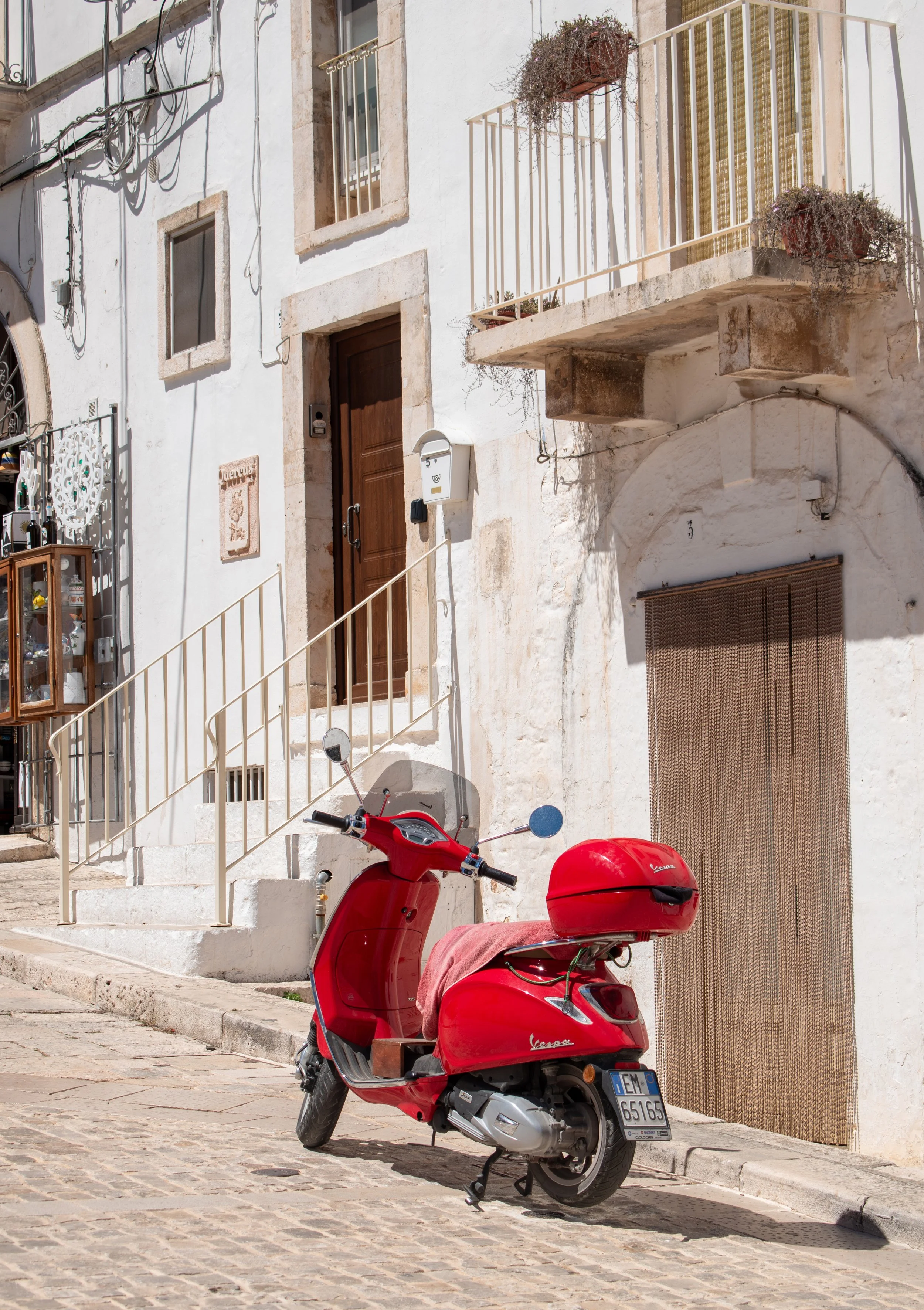 Red Vespa scooter parked on cobblestone street in front of white building with stairs, balcony, and closed shutters.