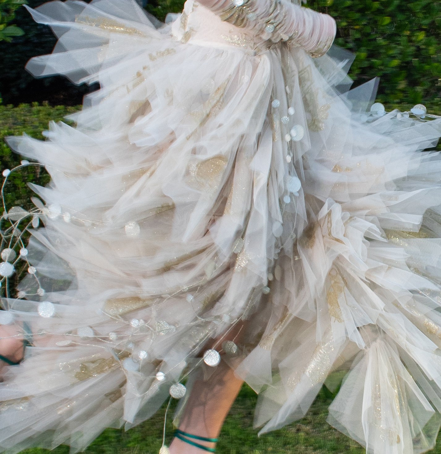 Close-up of a flowing, Zimmermann layered, beige and gold gown with tulle and embroidery, outdoors on grass.