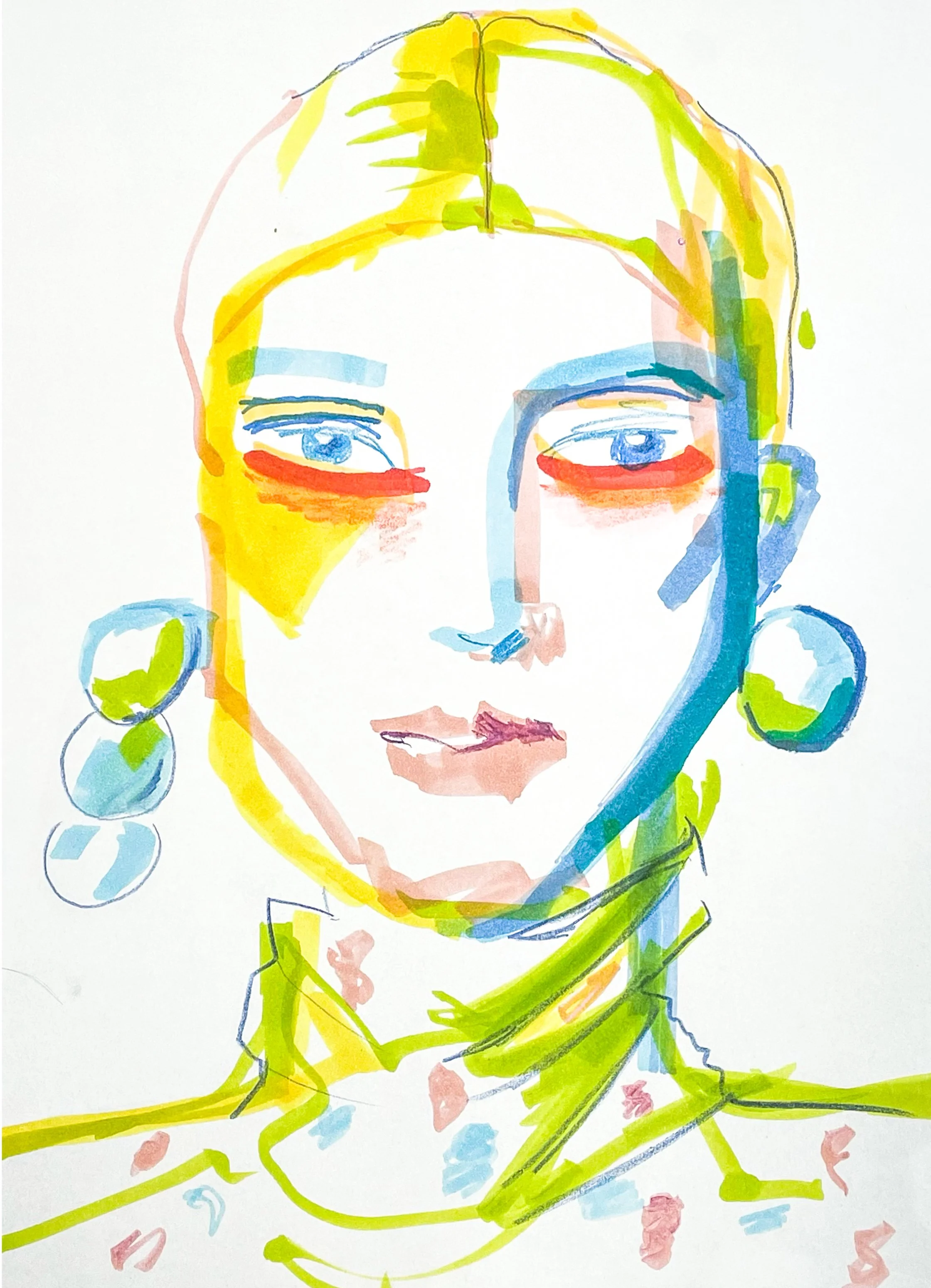 Colorful abstract portrait of a woman with earrings, using vibrant shades of yellow, blue, green, pink, and red, with expressive brush strokes and minimal detail.